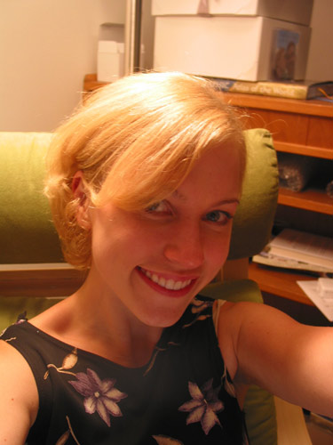 It was really cool–it was just the clear liquids from the tomato, so it was basically transparent with only the very lightest hint of pink. I’m going to have to try to make that. The one on TV was served with a skewer of fresh mozzarella and cherry tomato; Matt’s had hot pepper slices floating in it. They are both meant to be served very cold. The one last night was a knockout; it was the perfect complement to the hot flavors and textures of the food. I am definitely going to have to give that a try, what with our bumper crop of tomatoes. Anybody know where I can get cheesecloth around here?